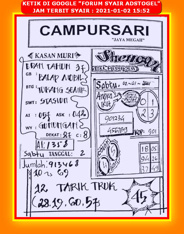 Syair campur sari sgp hari ini sudah di tambahkan mbah silahkan cek syair lengkap nya di atas. Agar tidak ketinggalan ulasan togel hk di hari berikutnya. Secara berkala tunggu sampai syair muncul pada porum prediksi syair singapura. BONUS DEPOSIT 5 SETIAP KALI DEPOSIT BISA CLAIM. Syair Hk Malam Ini Campursari. Syair Hk Malam Ini CampursariLIVE SGP 45 2021 Snin Rabu Kmis Sbtu Mggu 7790 3196 8056 8819 0715 8752 7902 6678 3506 8993 5083 1308 3935 4171 7728 8876.